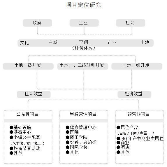 综合考虑政府、企业、社会三方诉求,通过文化、自然、空间、产业、土地五个维度的梳理,联动土地开发模式的思考,形成更有利于实际操作和后期运营的项目定位研究思路。